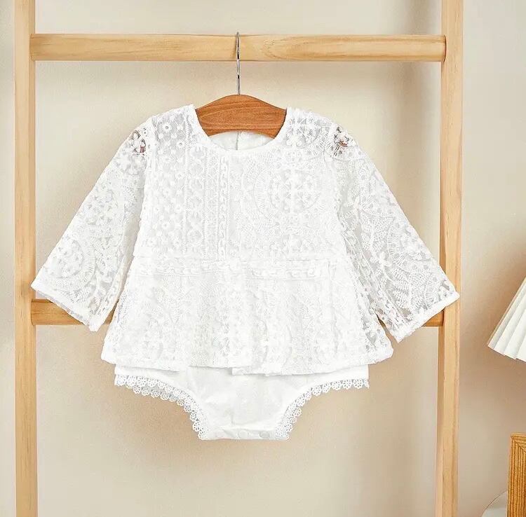 真っ白な総レースロンパースで、バースデーフォトなどにピッタリです♡